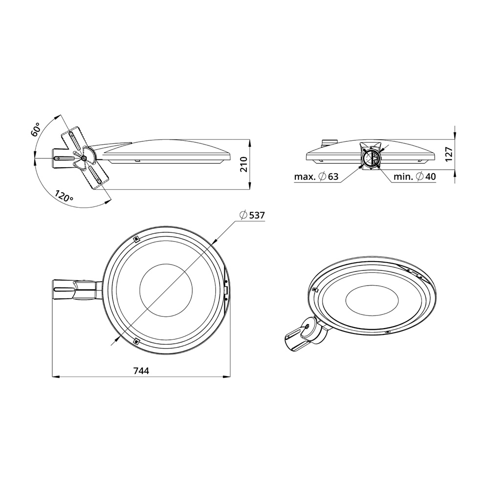 • Монтаж осветительных приборов осуществляется на вертикальную опору диаметром 62 мм при помощи специальных болтов, которые включены в комплектацию. На заказ возможно изготовление опоры с другим диаметром посадочного отверстия.