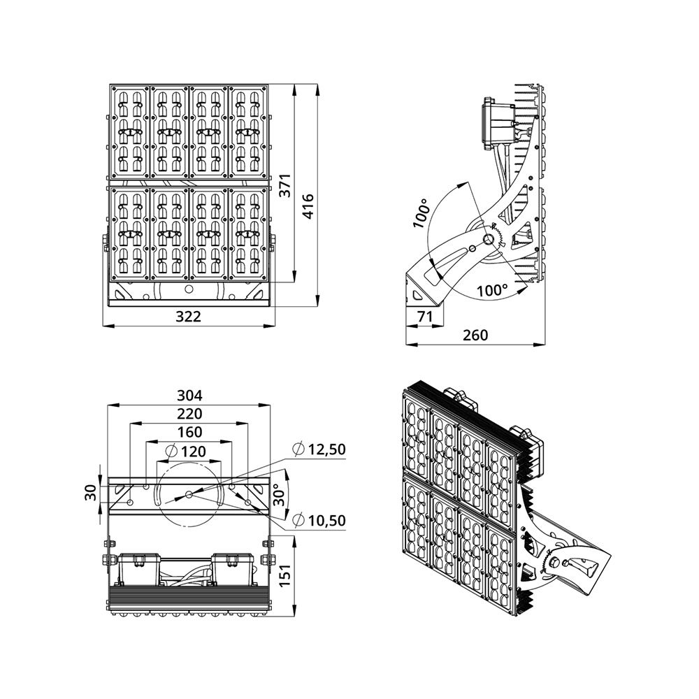Прожекторы мощностью 200–300 Вт поставляются с кронштейнами, которые имеют специальные зубцы для облегчения регулировки прибора.