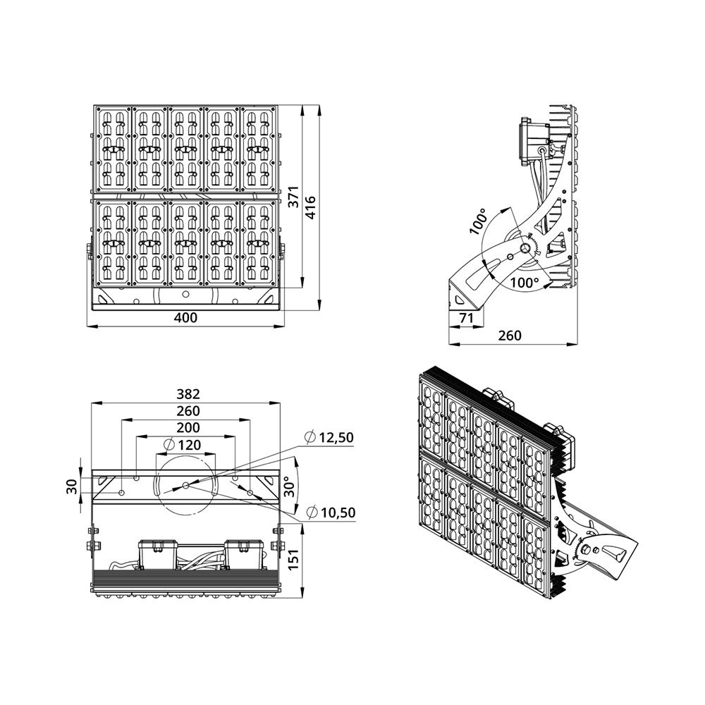 Прожекторы мощностью 200–300 Вт поставляются с кронштейнами, которые имеют специальные зубцы для облегчения регулировки прибора.